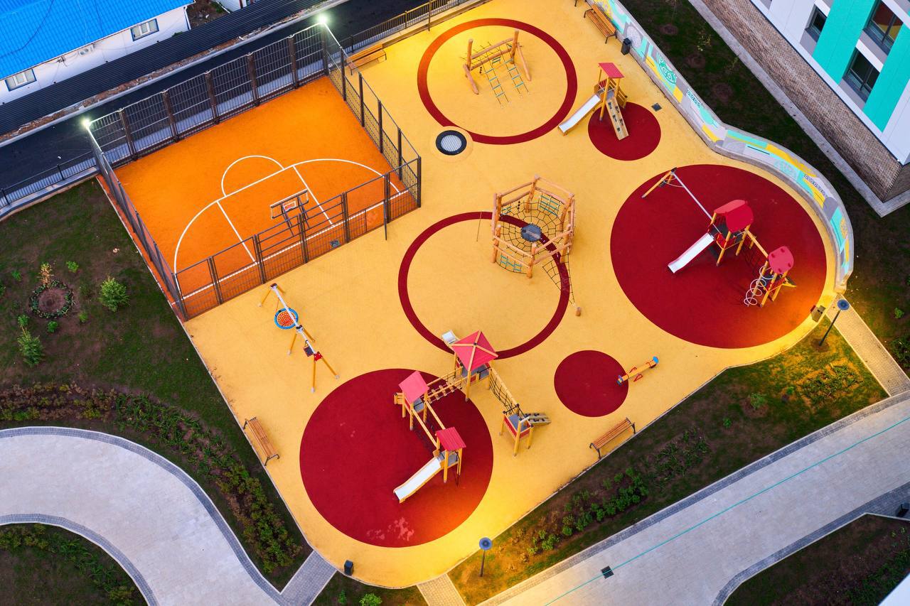 Территория комплекса закрыта и охраняется круглосуточно, обеспечивая безопасность и комфорт для жителей. Во дворе расположены зоны отдыха с беседками, workout-зоны с уличными тренажёрами и игровые площадки для детей всех возрастов. Для удобства жильцов предусмотрены подземный паркинг и велопарковки.